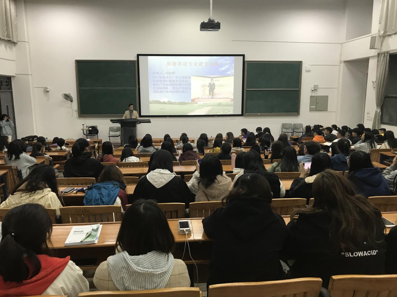 12月6日晚,应用外语学院旅游英语专业举办了一场“旅游行业发展概况及其人才需求”知识讲座。受院党总支副书记罗春科邀请,旅英专业2010届毕业生彭兆熙到校为我院18级、19级旅英专业同学做主题讲座。