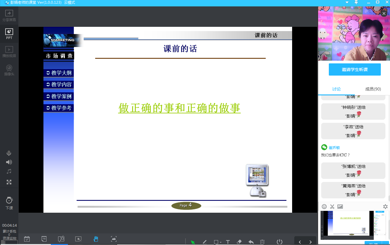 市场营销专业于2月中旬开始组织任课老师开展了全面网络教学准备工作,通过三次视频会议进行教学工作的探讨和部署。一方面老师们积极开展优慕课平台课程资源的建设,另一方面为了提高学生教学的组织性,还积极准备各种直播教学模式的尝试,努力争取实现直播和平台资源混合式教学。2月25日至27日,每位老师开展了一次教学班级的混合式教学试课,同学们反应强烈,对老师们的准备工作给予高度认可和配合。28日,专业通过视频会议再次就接下来的教学过程进行探讨,老师们表示已做好充分准备迎接接下来为期一个月网络教学。