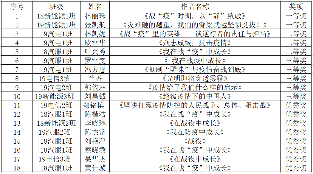 为进一步深入贯彻习近平总书记关于坚决打赢疫情防控的人民战争、总体战、阻击战的重要指示精神,进一步加强汽车工程学院疫情防控宣传工作,针对性地在学生当中开展精神文明教育,鼓舞广大学子抗疫斗志,坚定抗疫信心,我院根据我省和威尼斯官网相关文件要求,紧抓时代契机,于2020年2月30日—3月27日在全院范围内开展“我在战‘疫’中成长”抗疫征文活动。