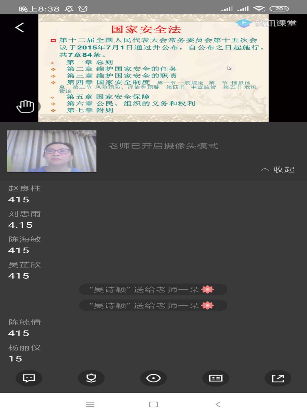 马克思主义学院任课教师以网络为平台,以“坚持总体国家安全观,统筹传统安全和非传统安全为决胜全面建成小康社会提供坚强保障”为主题,通过学校优慕课网、腾讯直播课堂、雨课堂等具体手段,开展形式多样的专题教育。