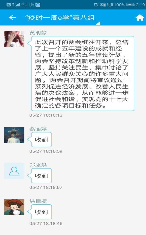 此次主题激发入党积极分子对于当代社会在教育、生态环境保护、社会治安、疫情防控尤其是公共卫生等各项民生领域的思考。同学们在各自线上小组中积极发言与讨论,通过自身所见所闻所历,思人民之所思,想群众之所想。同时,大家也在线上分享了特殊时期两会的变与不变、秒懂言读。通过“议案”的方式,让入党积极分子以当代青年身份关心社会时事,对于国家建设和民生问题有着自己的见闻和看法,对国家和人民报有使命和担当。