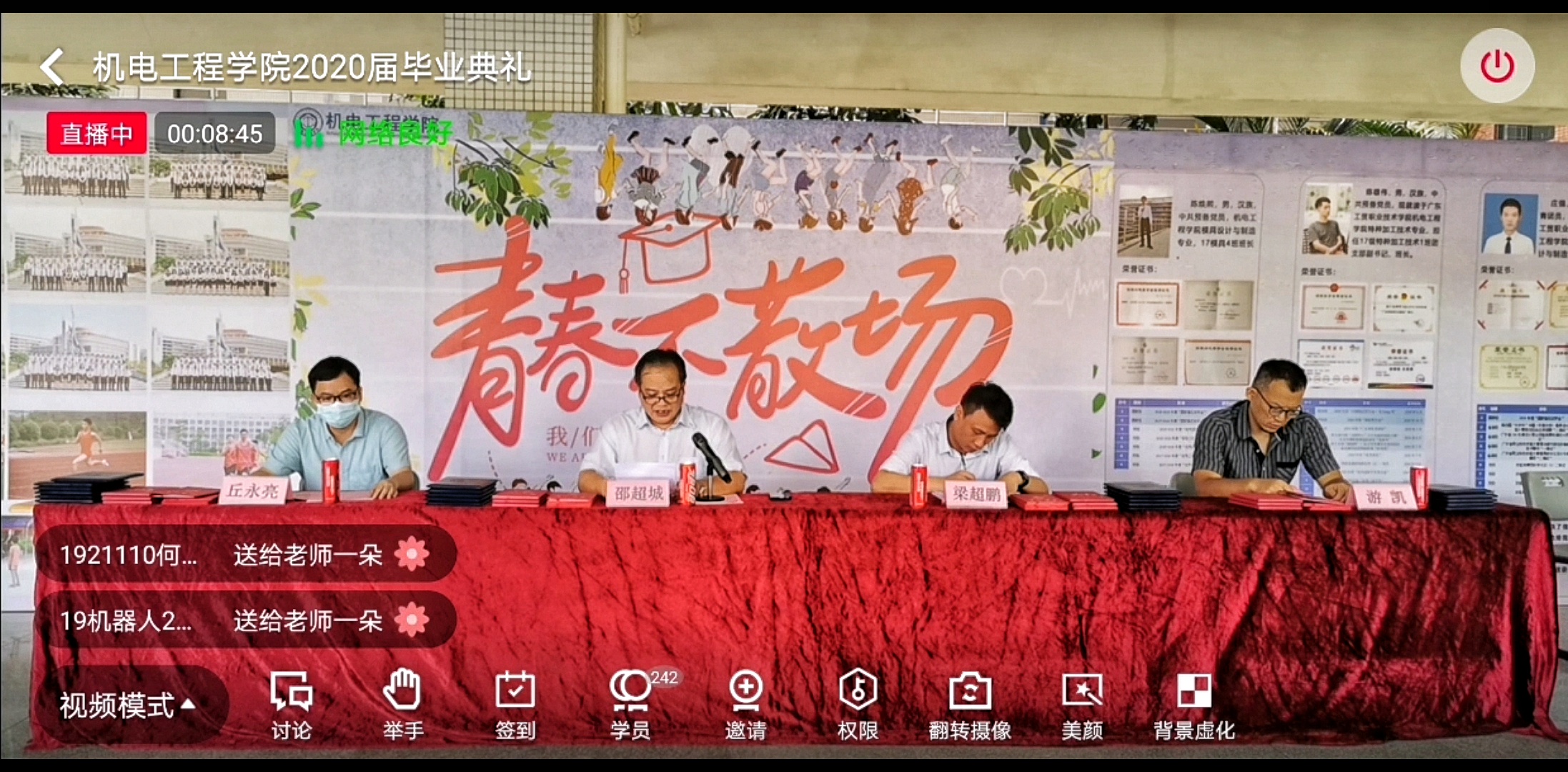 根据学校统一安排,于6月23日,机电工程学院2020届毕业生返校办理离校手续。在常态化疫情防控期间,为了确保广大师生安全,机电工程学院在明德楼1区一楼举办2020届“云”毕业典礼,出席会议的有机电工程学院党总支书记邵超城、机电工程学院党总支副书记梁超鹏、机电工程学院副院长丘永亮、游凯,机电工程学院学工办主任严惠琴、机电工程学院辅导员、毕业班班主任及毕业生代表。其他同学通过腾讯课堂观看毕业典礼直播。毕业典礼由梁超鹏主持。