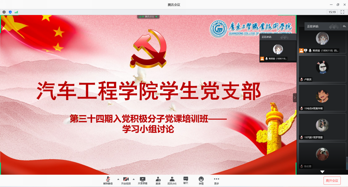 会议伊始,主持人赖燕瑜同志就本次学习活动的目的做了简单说明,全体学员以小组为单位,讨论并分享自己对于正确入党动机的认识。在讨论期间,积极分子们踊跃发言,积极分享。19新能源1班张龙珠发表了自己的观点:对祖国和人民充满热爱,愿意全心全意为人民服务,在建设中国特色社会主义、实现中华民族伟大复兴、祖国繁荣安康的过程中,能做出自己力所能及的贡献。19汽服2班陆安宇结合自身立足当下,眼眺未来,认为作为一名积极分子,学习是现阶段的首要任务,拥有知识,将来与祖国一起完成中国梦。