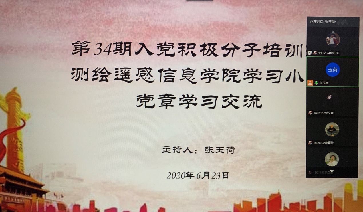 6月23日晚20点,测绘遥感信息学院党总支组织第34期入党积极分子培训班的本学院学员开展党章学习交流。活动通过腾讯会议平台线上开展,由测绘学院学生第一党支部书记张玉荷主持,学院共61名入党积极分子进行了学习交流。