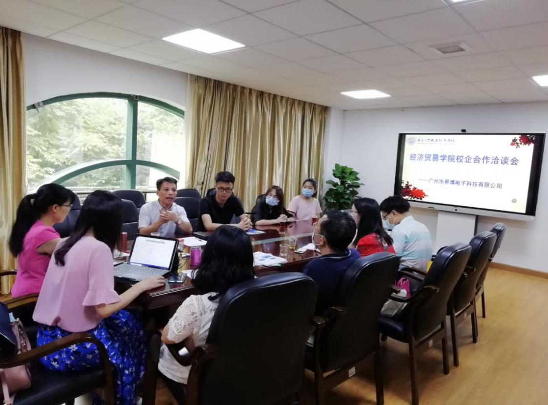 为推进我院校企合作建设进一步开展,2020年7月1日下午,由广州市昇博电子科技有限公司董事长廖振雄等4人组成的企业访问代表到访威尼斯官网,经贸学院院长邱秀芳教授、副院长方洁教授、办公室主任邓彩云、商贸系主任蒋晶、营销系主任严琳、国际贸易专业带头人李政敏、电子商务专业带头人方文超一起参加了交流,双方就校企合作工作进行了热烈的洽谈。