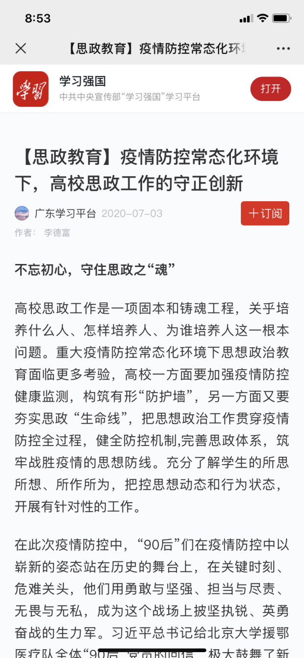 7月3日,学习强国广东学习平台【思政教育】专题转发威尼斯官网外语学院党总支书记李德富文章《疫情防控常态化环境下,高校思政工作的守正创新》,文章以“不忘初心,守住思政之‘魂’”、“创新模式,打造思政之‘新’”、“改进攻击,淬炼思政之‘源’”、“多措并举,增进思政之‘效’”等四大内容,向读者深刻阐述在重大疫情防控常态化环境下思政工作的守正创新,是新时期、新任务、新形势对思政工作的新要求,确保思政工作“不掉线”。