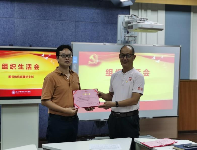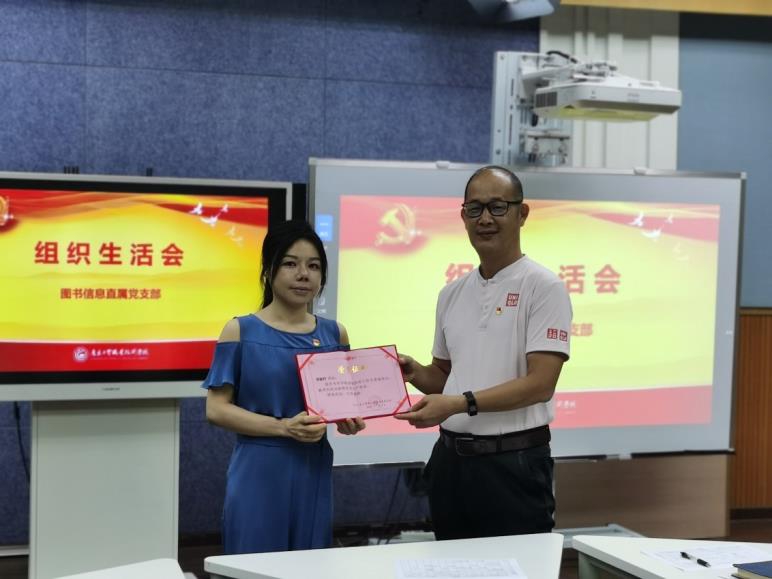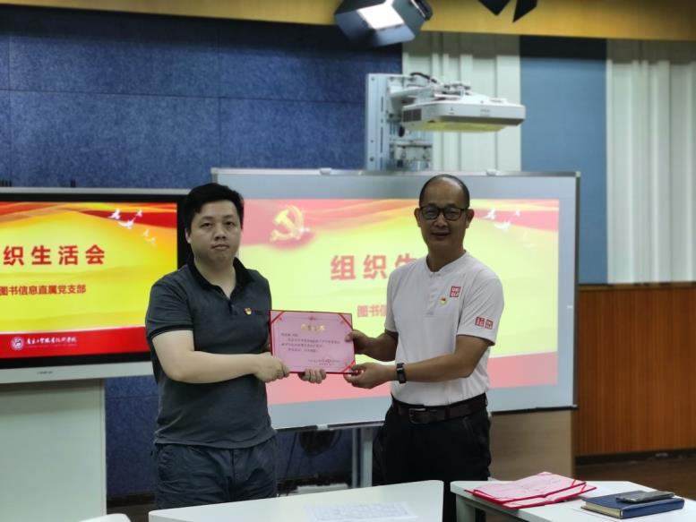组织生活会的第四项,由陈珊兴副校长、支部副书记汪宇波分别为受学校表彰的抗击疫情先进基层党组织:图书信息直属党支部;优秀党支部书记:王斌;教工优秀共产党员:周平、曾南昌;抗击疫情优秀共产党员:卢志海、梁毓玲、詹东霖进行颁奖,大家用热烈的掌声表示祝贺。