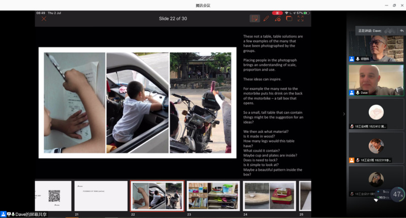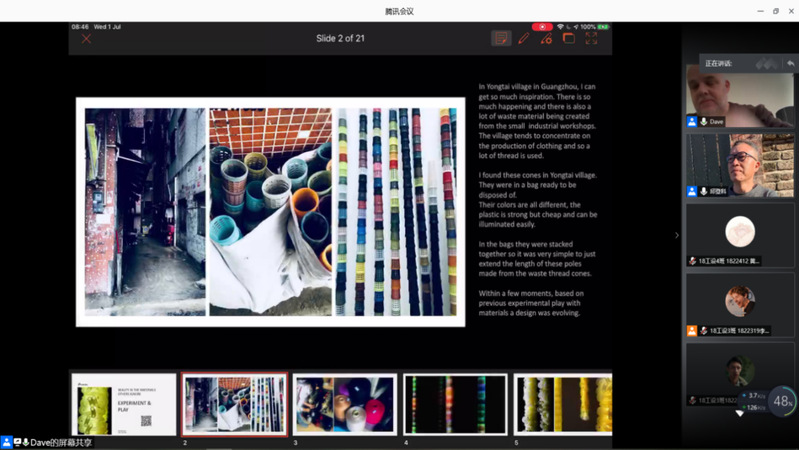 工作坊于6月29日举行了网络开课仪式,徐勇军院长致欢迎辞并对前3届工作坊做了回顾(图1),对同学们的学习提出了相关要求。接着David Bramston教授和邱登科教授做了“设计灵感的来源”为主题的开课讲座(图2-图4)。David Bramston教授将自身的经验授予同学们,如何正确理解Upcycling、认识材料、感知材料,用幽默的语言、渊博的知识、生动的讲解激发了同学们对设计的重新认识以及更加深层次的热爱。