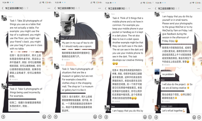 由于英国时差,David Bramston教授和邱登科教授教学时间安排为:下午14:30-17:00为直播教学,晚上18:00-21:00为微信平台小组互动答疑和作业评讲时间,上午8:30-11:30为校内教师协助落实学生的设计实践任务。