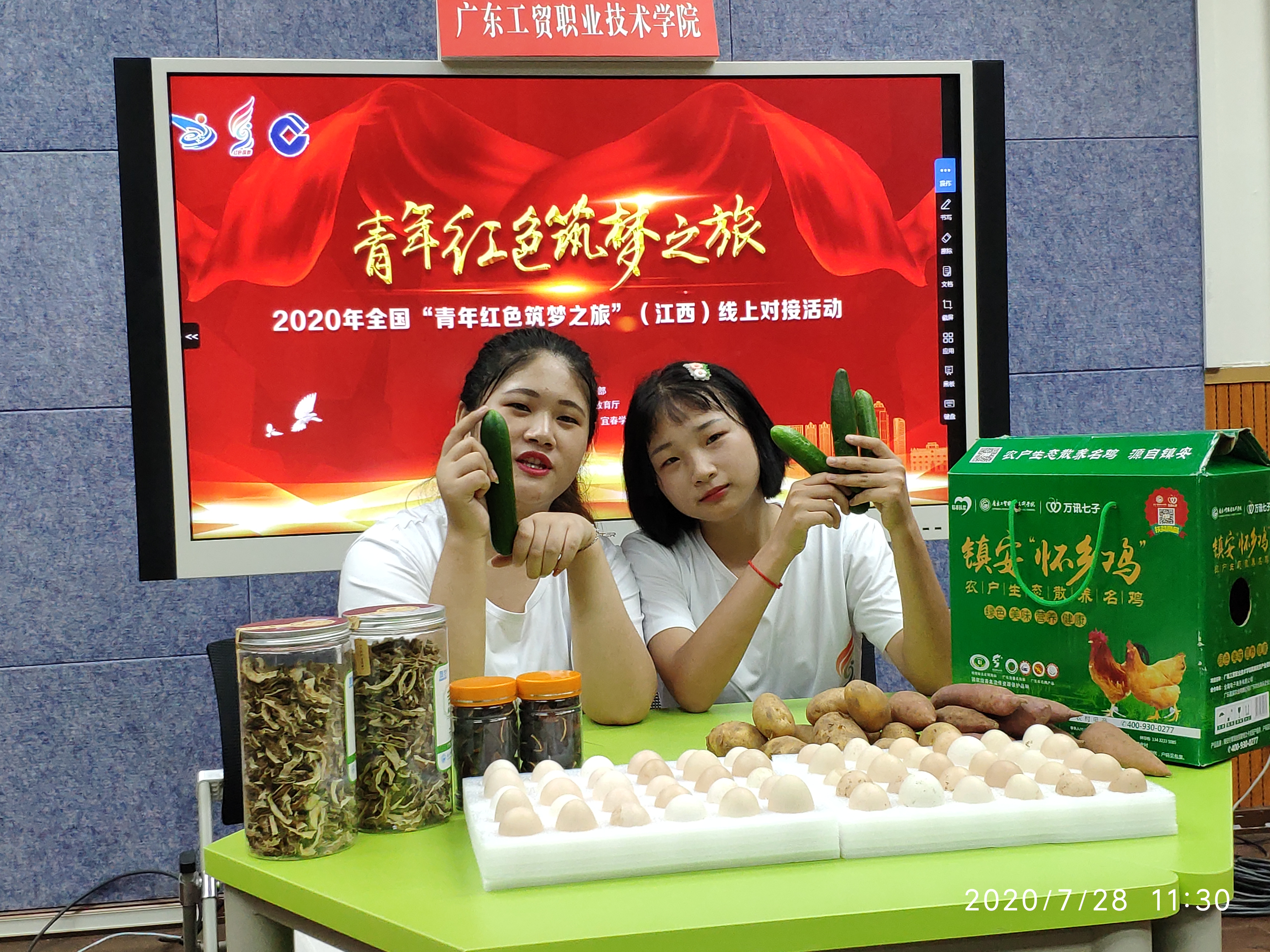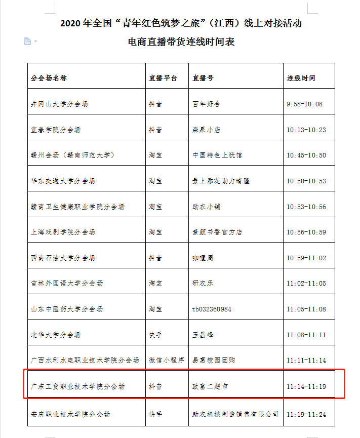 7月28日,第六届中国国际“互联网+”大学生创新创业大赛全国“青年红色筑梦之旅”江西线上对接活动成功举行。活动由教育部主办,江西省教育厅承办,南昌大学、井冈山大学、宜春学院、萍乡学院协办。威尼斯官网“致富二超市项目”作为广东省教育厅的十个代表项目之一参加了本次活动,同时,威尼斯官网被指定为本次活动中“红旅”扶贫产品电商直播连线广东省唯一分会场。