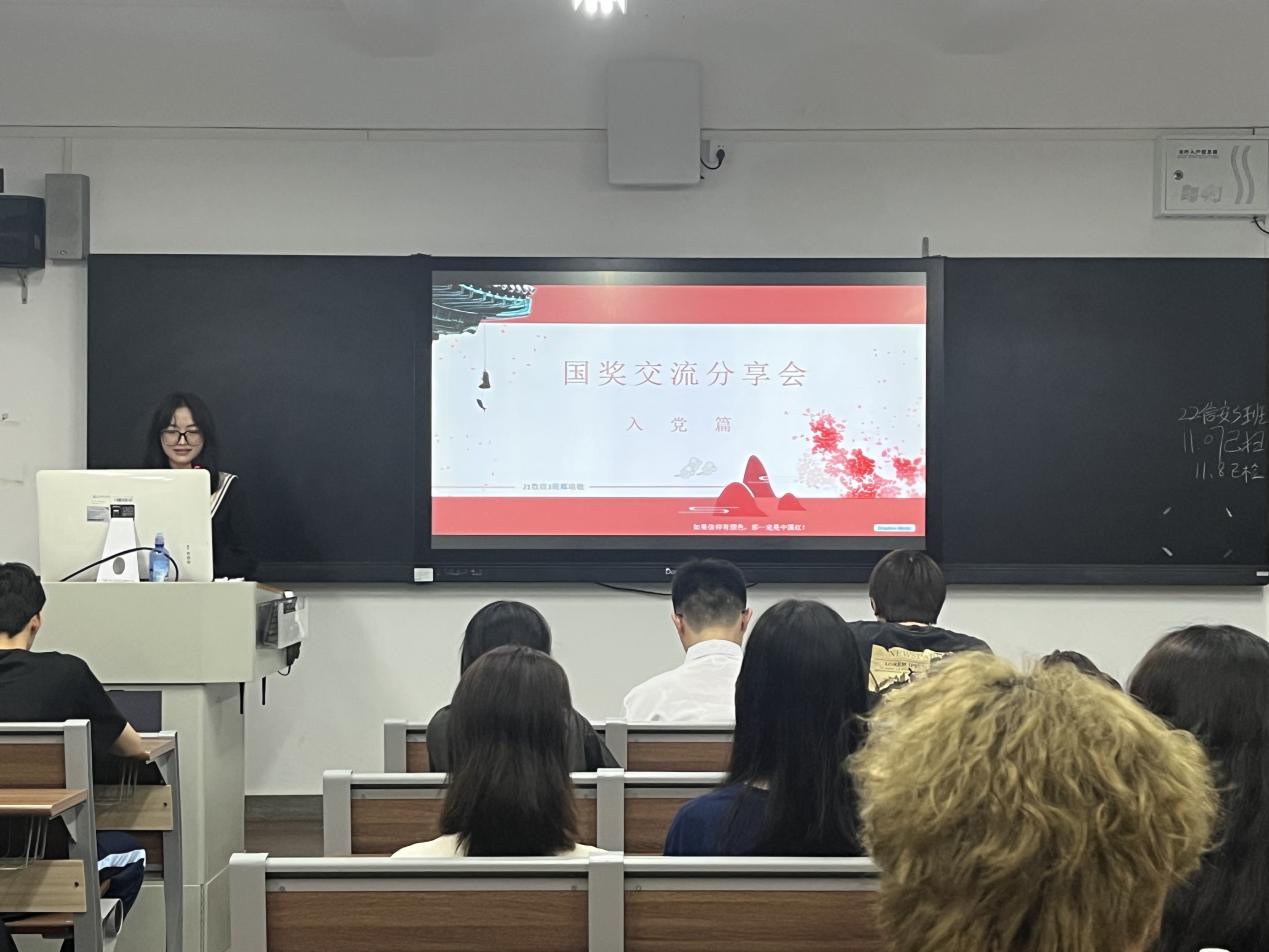 交流会首先由荣获2022-2023学年国奖奖学金奖项的四位优秀学生分别从科研、学术、思想与实践四个方面分享个人所获成绩及心得体会。