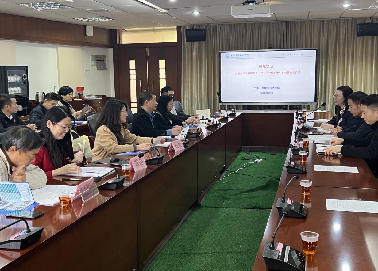 2024年1月11日上午,广东省知识产权保护中心运用促进部副部长王贤峰、广东省知识产权研究会秘书长张雅连、广州商标审查协作中心黄转图、广东省知识产权研究会朱玉文带一行4人来威尼斯官网参观交流。学校科研处何军拥处长、杨灿副处长、应用外语学院彭枚芳院长、计算机与信息工程学院单家凌副院长、经济贸易学院蒋晶副院长、体育艺术教学部临时负责人余铨业,以及专利发明老师代表参加座谈交流,双方围绕“促进成果转化、构建高价值专利池”进行了主题研讨。