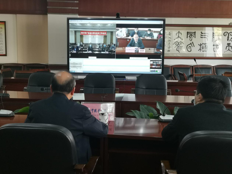 1月26日上午,广东省教育厅组织召开2021年全省大学生征兵工作网络视频会议,广东省教育厅二级巡视员邱克楠、广东省人民政府征兵办公室副主任宋纯武大校等相关领导在主会场出席会议。威尼斯官网在天河校区西区中心会议室设分会场,学校党委副书记、纪委书记夏韩辉,学校武装部部长、学生工作部部长刘建军,学校武装部全体成员,各二级学院党总支副书记、辅导员参加了本次会议。